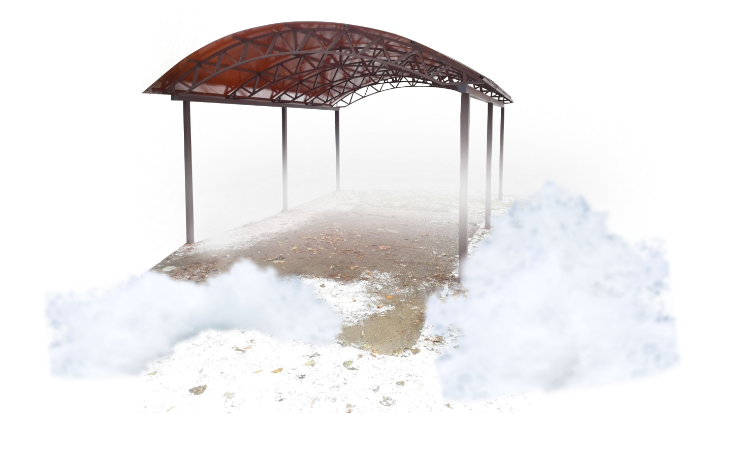 Высота по столбам:....................... 3,4 метра Столбы .........................................80х80х4 мм Фермы .........................................40х20х2 мм Обрешетка..................................40х20х2 мм Форма крыши..........................полукруглая Кровля.......поликарбонат POLYGAL 8 мм Цвет кровли.........................................бронза Основание...........................бетонные сваи